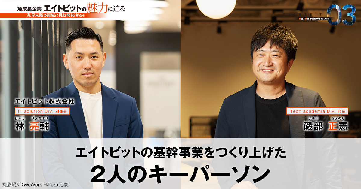 エイトビットの基幹事業である「エンジニアの技術力提供」。「1兆円企業」の実現という壮大な目標を掲げる同社にとって、この基幹事業のさらなる成長は、達成への欠かせない条件といえる。ここでは、「教育」「営業」の各領域で、基幹事業の構築に携わってきた2人のキーパーソンを取材。同社がめざす「人が成長し、希望を持ち続けられる仕組み」はいかにして実現されるのか。それぞれの役割やそこにかける想いなどを聞いた。