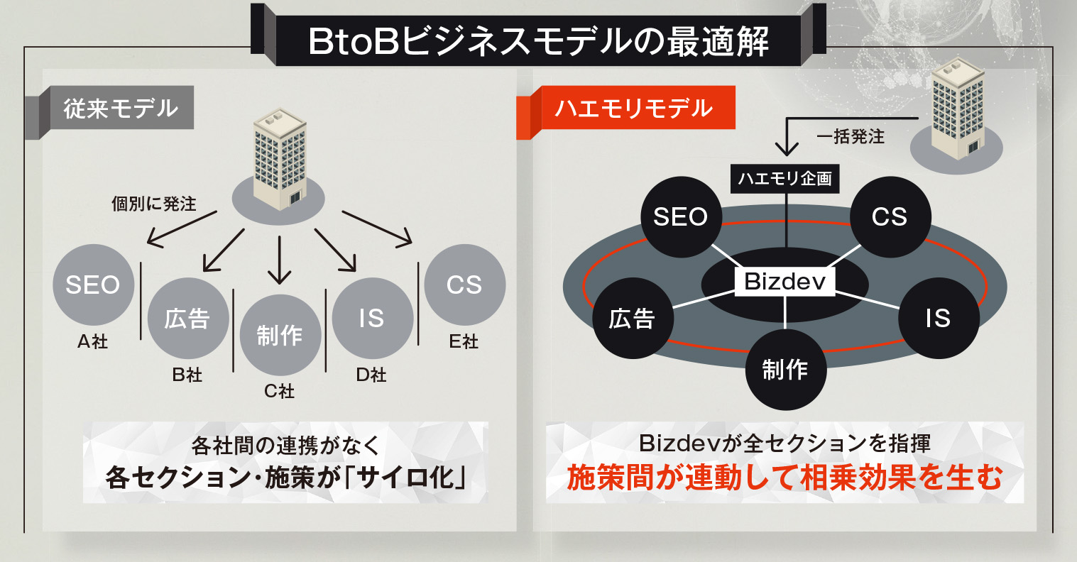 多くの企業は自社に不足する専門性を補うため、施策ごとに外部へ委託し、いわゆる「The Model(※)」を構築しています。しかし、このモデルは各施策が連携なく進む「縦割り構造」に陥り、全体最適が失われがちです。たとえば、SEO担当が設置したリンクをWeb制作会社がデザインを優先して削除するなど、施策間の衝突で質とスピードが損なわれるのです。この「サイロ化」に対し、当社は施策全体を統括する「Bizdev」という人材を配置。専門知識のない顧客の事業担当者に代わり、戦略からディレクションまでを一貫して担い、委託先企業が行う各施策の連動性を高め、事業のスピードと精度を向上させます。