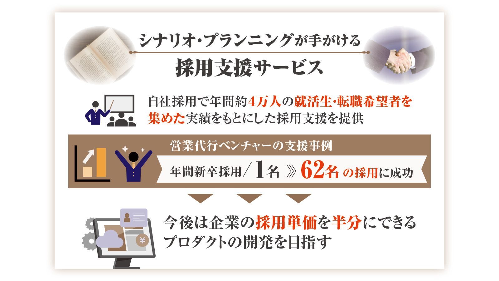 中小・ベンチャー企業に対して、新卒・中途の人材採用の支援をしています。採用を支援する企業は数多くありますが、当社は予算編成からターゲティング、ブランディング、広報媒体の選定および打ち出し方、選考フローの設計、説明会資料の作成、面接・クロージング・内定者のフォローといった採用戦略全般のコンサルティングを一気通貫で提供しています。クライアントとなる企業は業種・規模ともにさまざまですが、当社の支援で、それまで以上の成果につながるケースが非常に多いです。採用数もさることながら、クライアント平均でいうと、母集団形成は270%アップ、採用単価は41%の削減に成功しています。