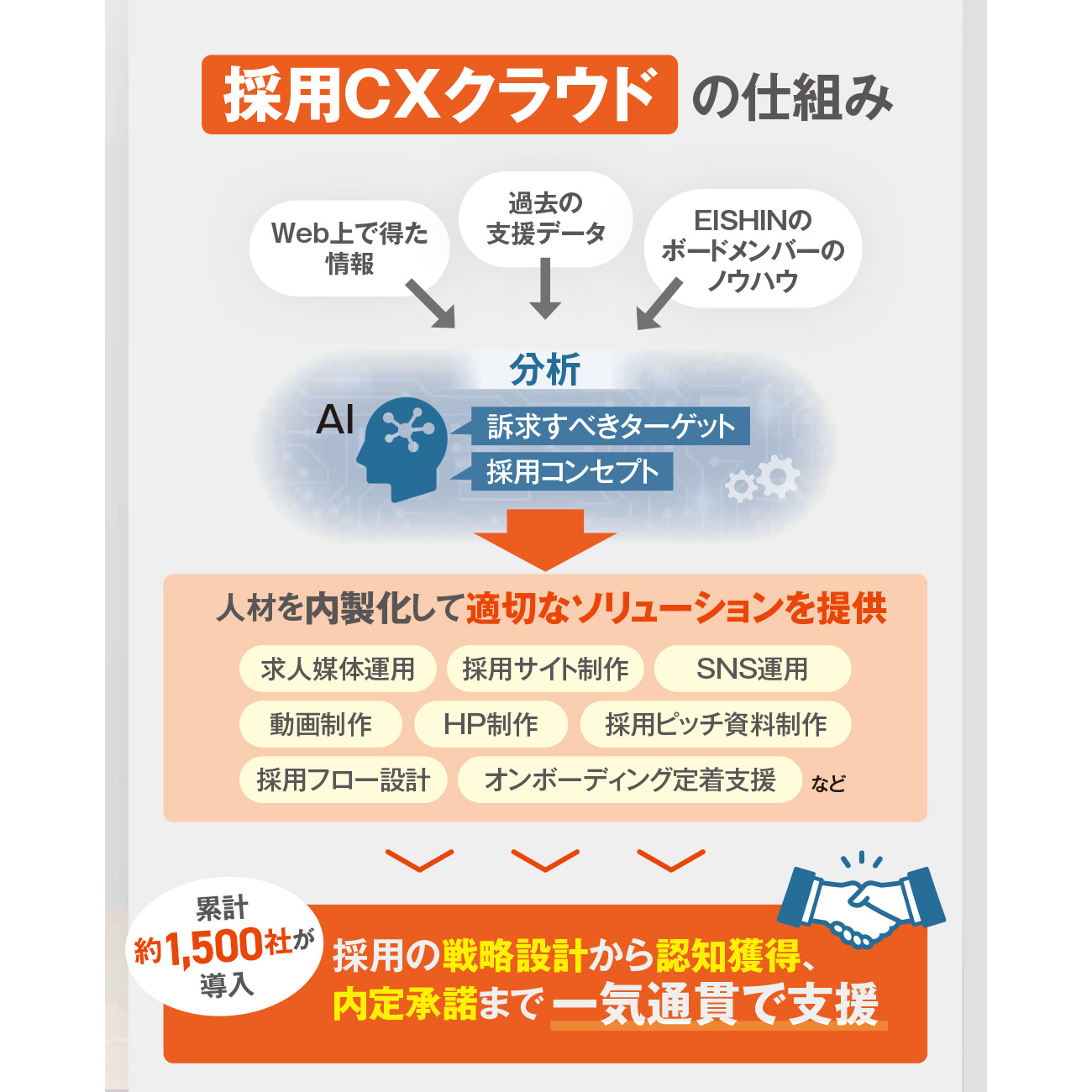 大手企業からベンチャー企業など幅広い企業に対して、人材採用支援を手がけているEISHIN。独自のプロダクト『採用CXクラウド』が好評で、累計約1,500社が導入しており、今期の売上は20億円を見込んでいる。「令和時代の強い組織をつくる」と話す同社代表の五十嵐氏は、競争ではなくメンバー同士で助け合って成長する企業風土づくりに注力しているという。今後は採用を強化していく方針の同氏に、『採用CXクラウド』の詳細や求める人物像などを聞いた。